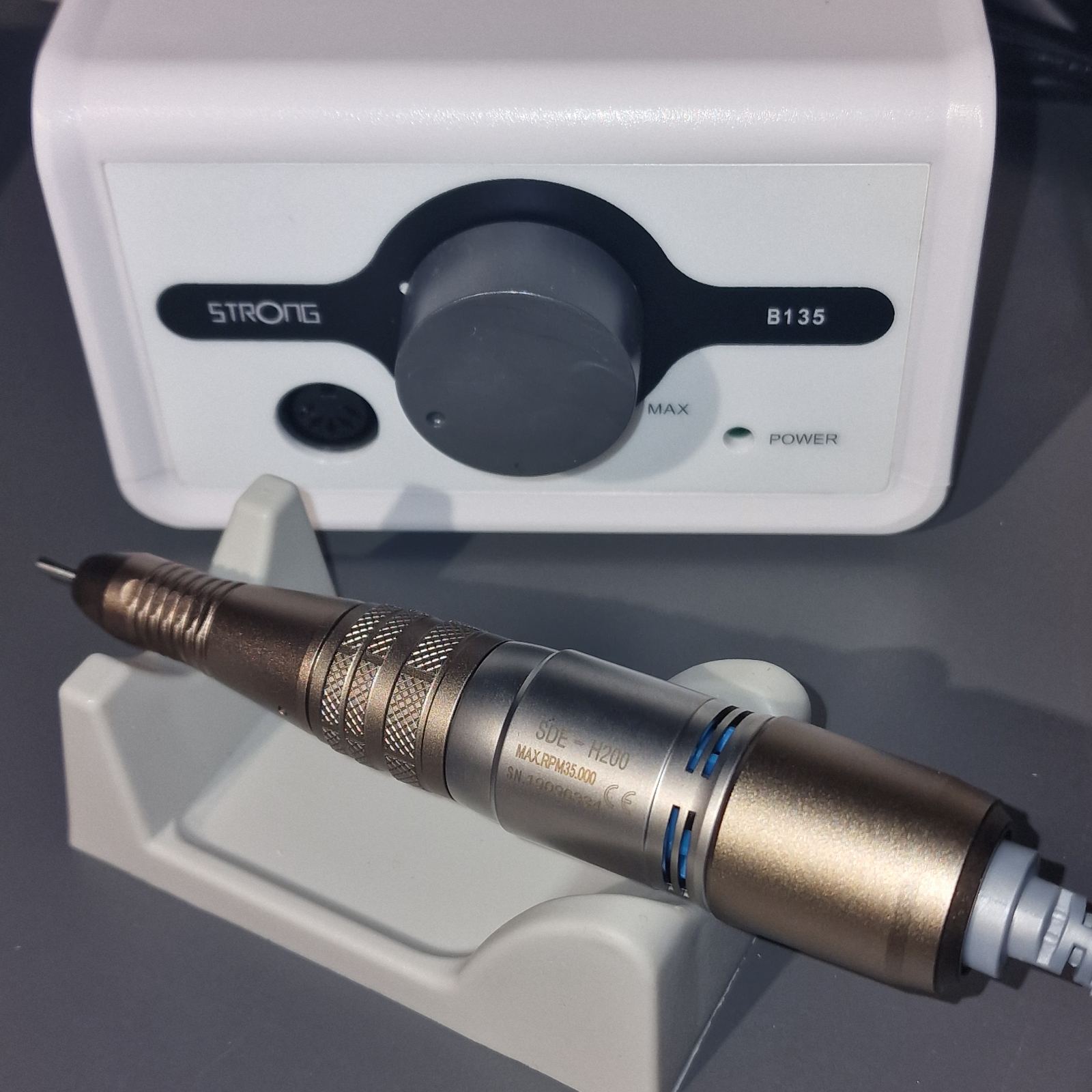 Strong B135 – ideal pentru manichiură intensivă pe tot parcursul zilei de lucru, deoarece micromotorul nu obosește mâna tehnicianului. Piesa de mână îmbunătățită, cu cuplul său mai mare, permite pedichiură fără efort.