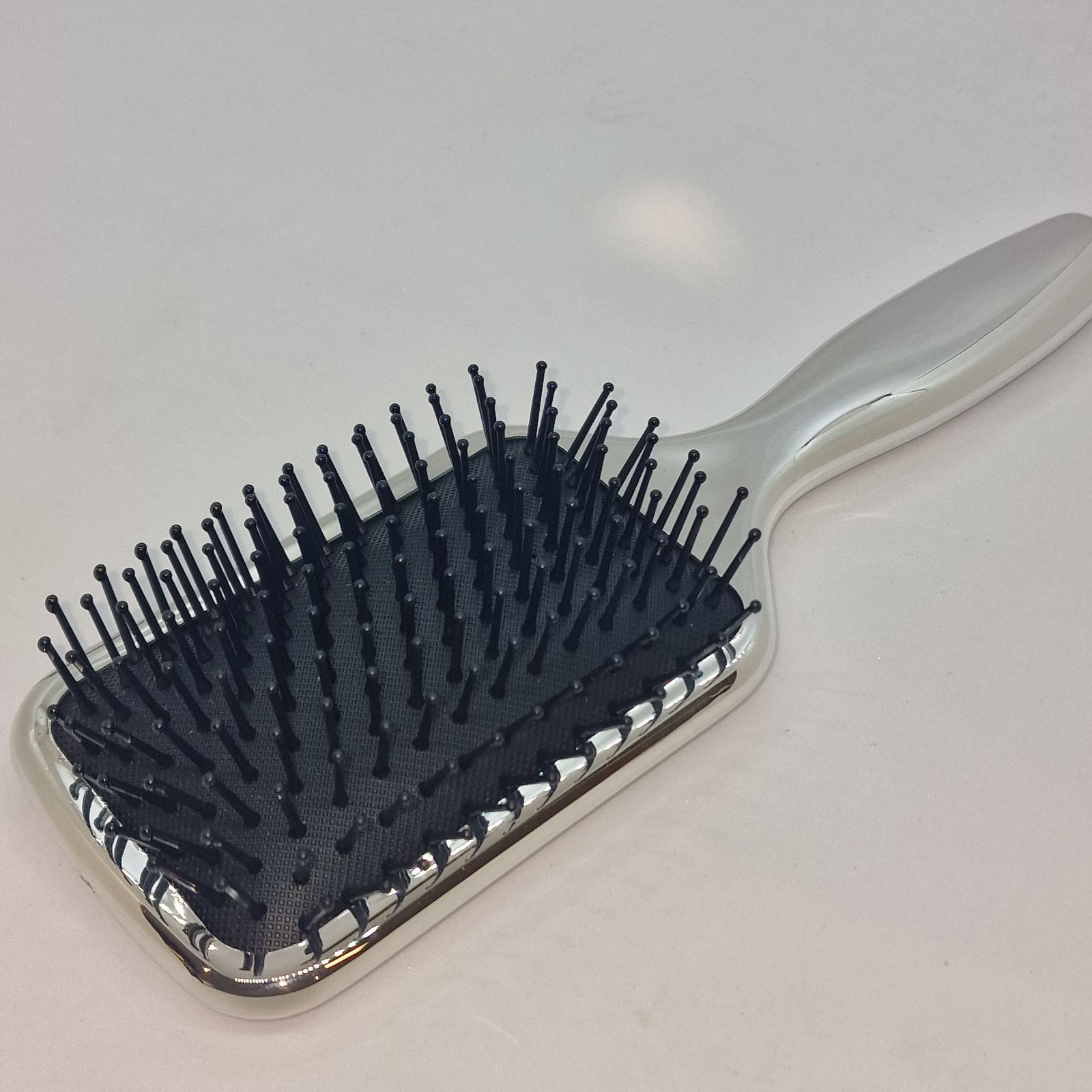 Silver Glide este o perie elegantă și funcțională, cu mâner ergonomic și peri moi cu vârfuri rotunjite, care descurcă și netezește părul cu delicatețe, fără să-l deterioreze. Ideală pentru îngrijirea zilnică, mai ales în timpul uscării cu foehnul.