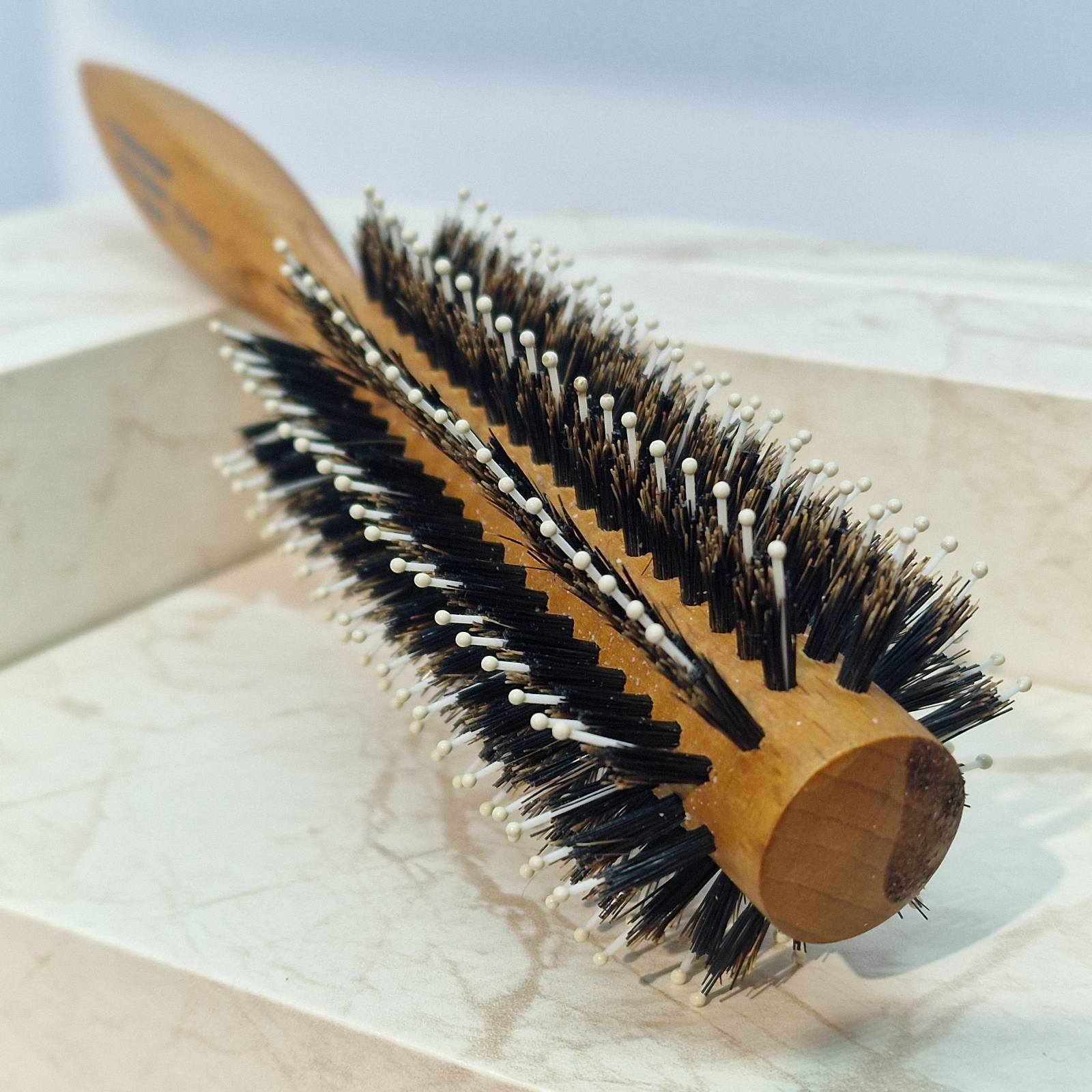 O perie rotundă moale cu bază din lemn.