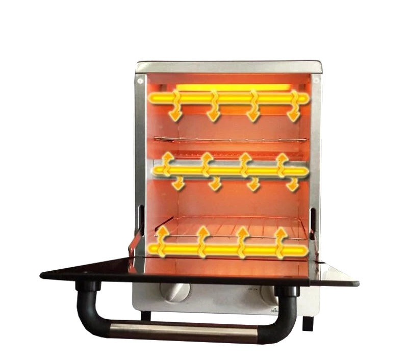 Благодаря этому скорость разогрева шкафа до 200 градусов достигается в течении 2-4 мин. Корпус данного аппарата состоит из металла. Дверца шкафа изготовлена из жаропрочного светоотражающего стекла .
