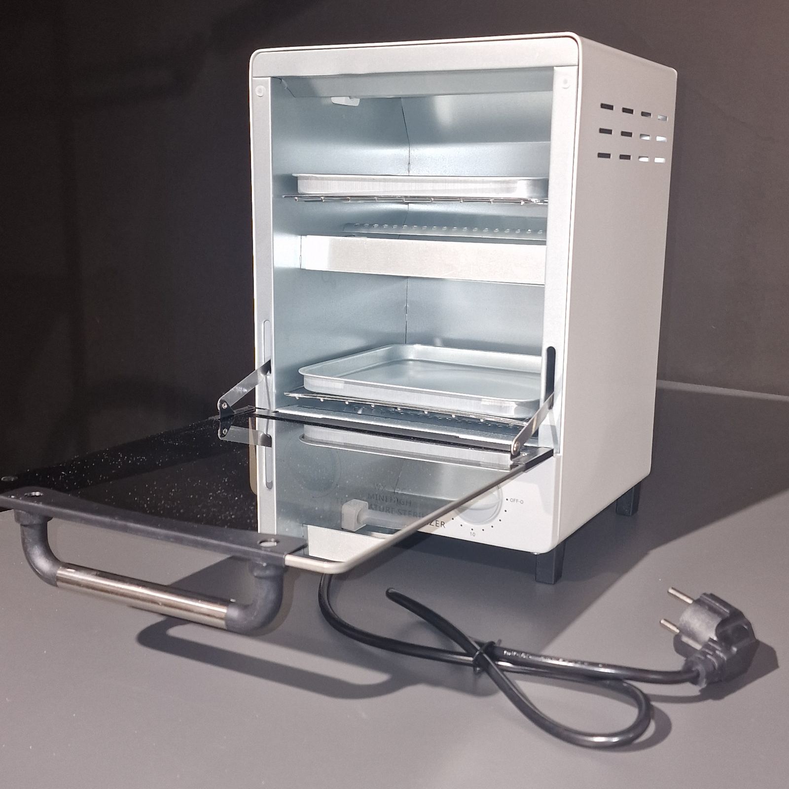Инфракрасный стерилизатор представляет собою шкаф с тремя вмонтированными инфракрасными нагревателями нового поколения. Мощность каждого нагревателя составляет 300 вт. Суммарная мощность стерилизатора 900 вт.